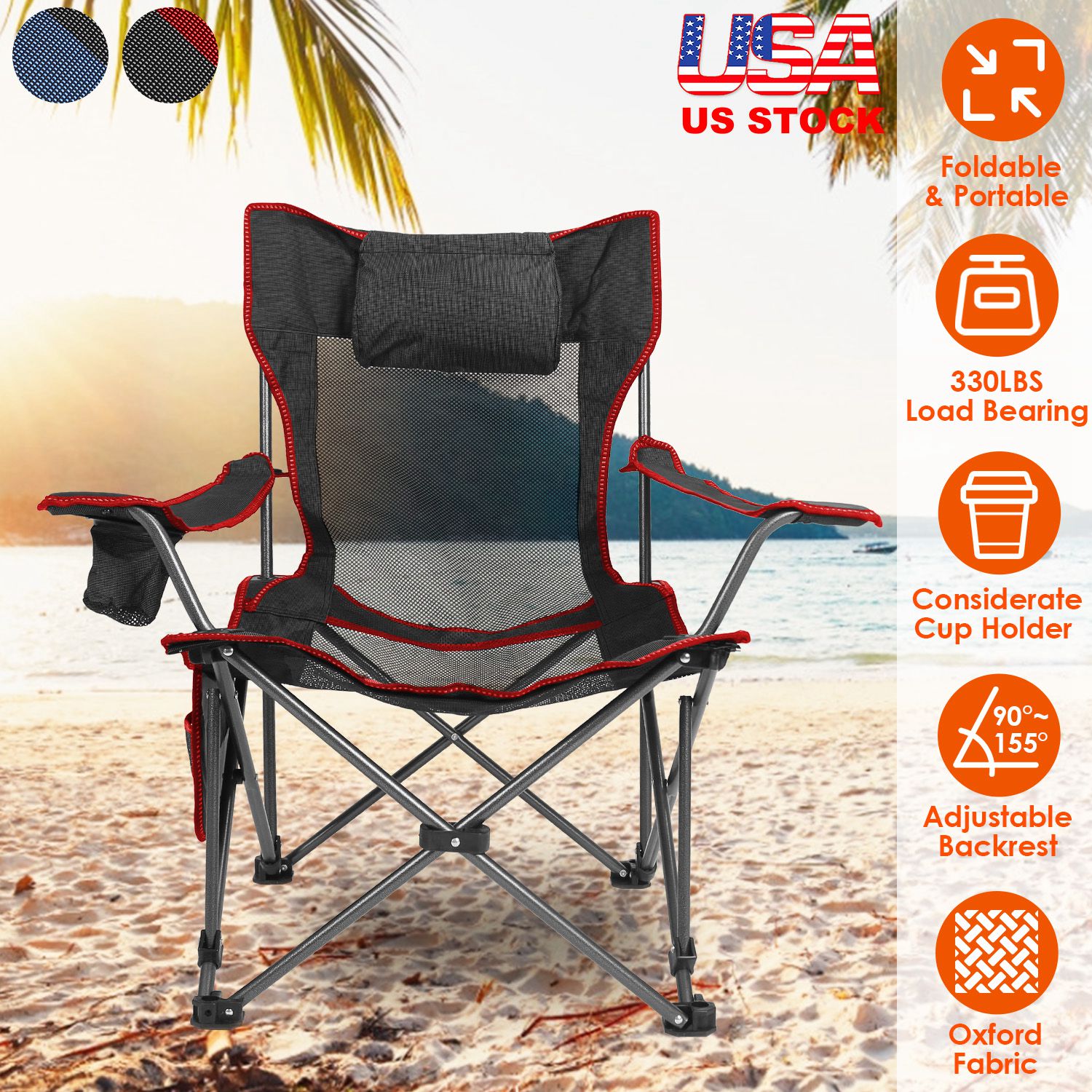 • 330LBS Max Load Chair: Come with thickened steel frame with 16mm in diameter, reinforced connection and strong 600D Oxford fabric, this folding chair’s max weight capacity is up to 330 lbs.