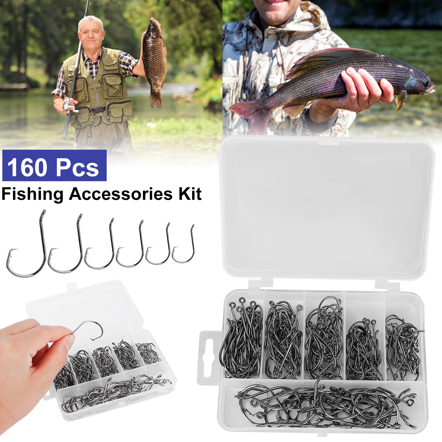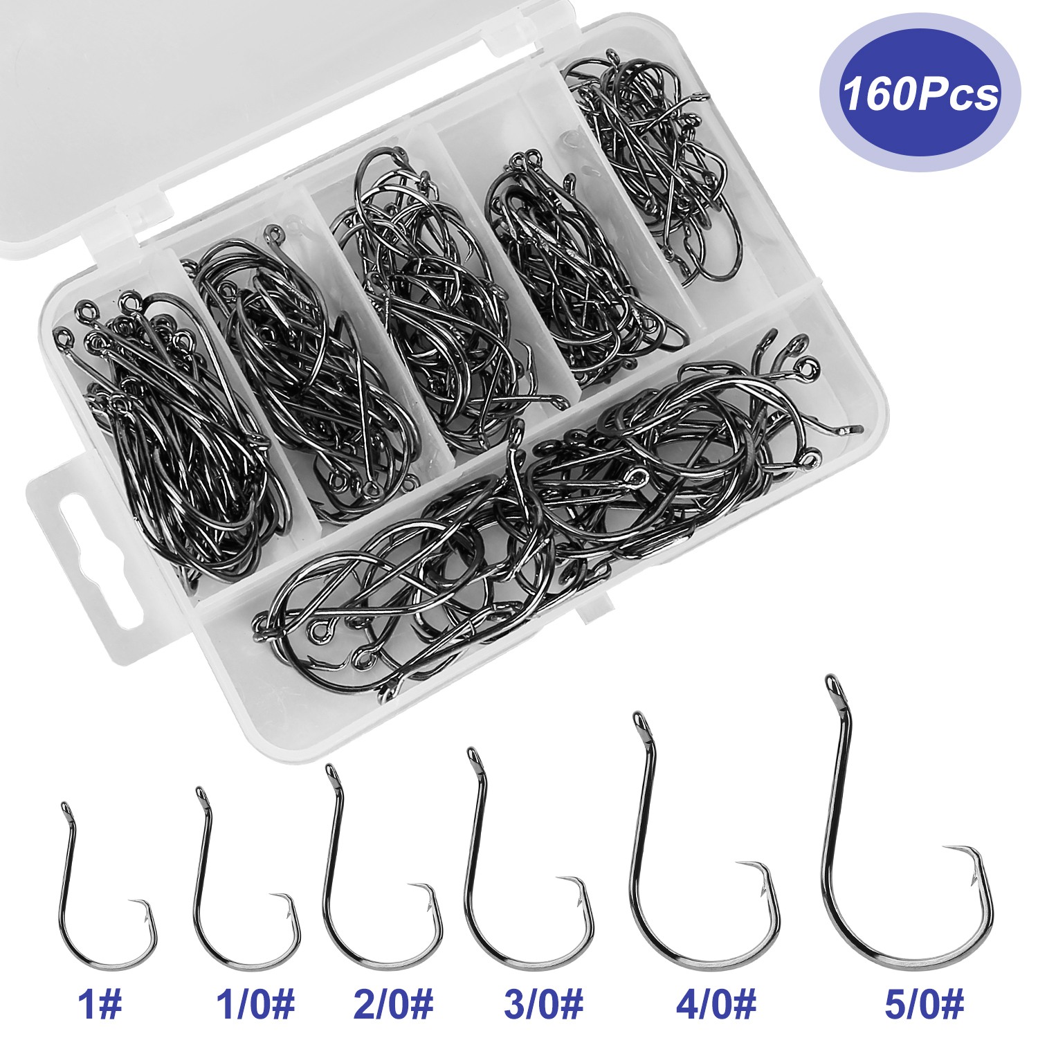 Come with 160 pcs fishing hooks with the circle shape design, which can reduce the mortality rate of fish. There are 6 size hooks in the package, including 1#, 1/0#, 2/0#, 3/0#, 4/0# and 5/0#. You can choose the size you need while fishing.